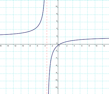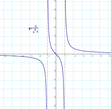 En el ejemplo anterior puedes ver una función racional cuyo dominio son todos los reales excepto 1 y -1 donde presenta asíntotas verticales. La recta $y=1$ es una asíntota horizontal