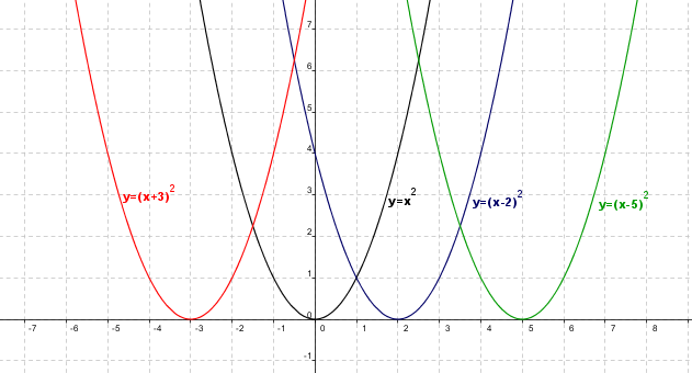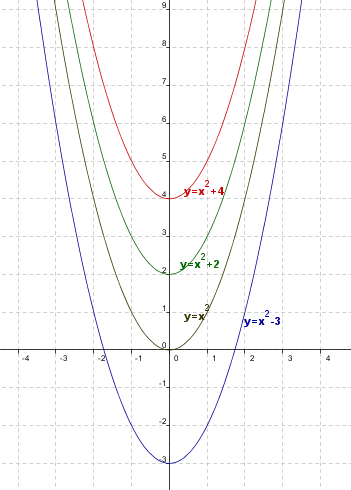Observa en la siguiente imagen la gráfica de la función $y=x^2$y las distintas traslaciones verticales: