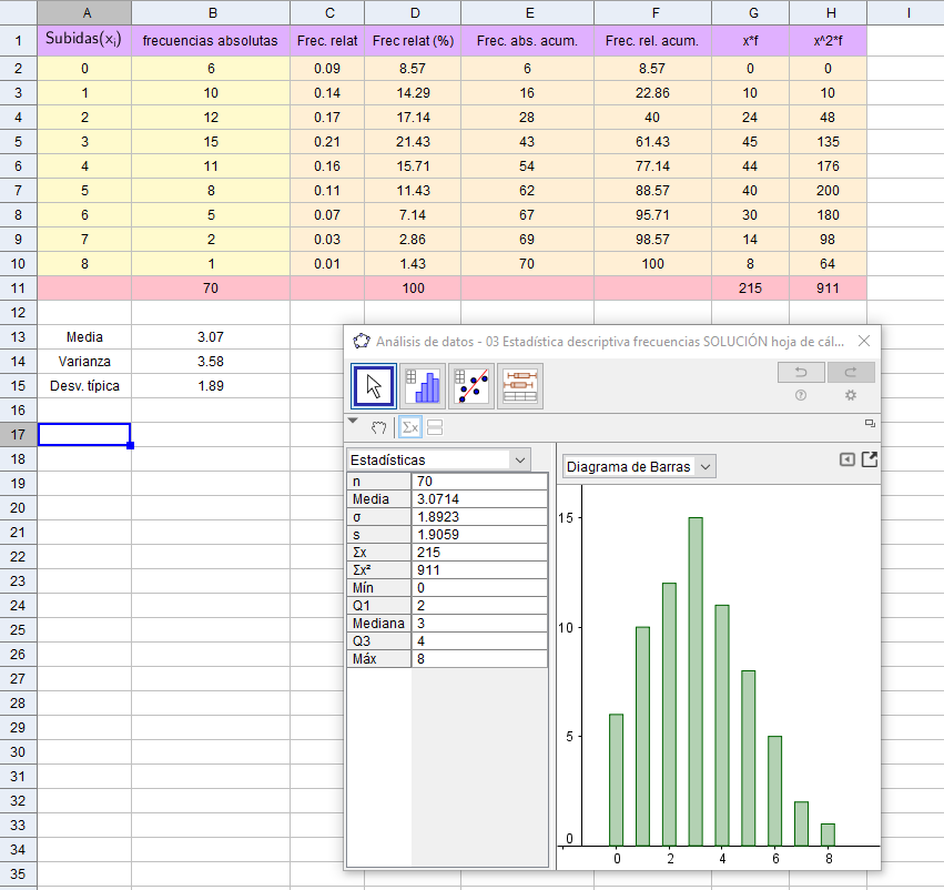 Ahora bien, nos puede interesar tener las frecuencias en la hoja de cálculo para realizar operaciones con ellas. Para eso, o bien escribimos los datos de la Tabla de Frecuencias anterior, o bien procedemos de la siguiente manera: