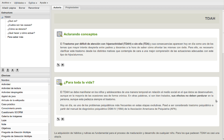 Tendremos que tener en cuenta que, dependiendo de las opciones de exportación que escojamos, el aspecto variará respecto a la previsualización en eXe. Con la opción Utilidades > Visualización previa o haciendo clic en el botón verás su aspecto como HTML.