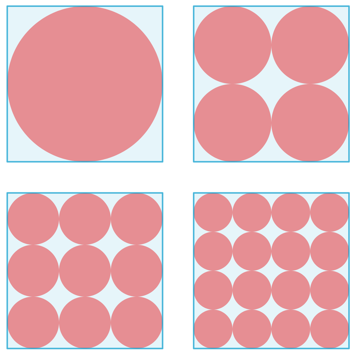 Tenemos cuatro cuadrados de lado unidad en los que aparecen distintas circunferencias sombreadas de rojo. ¿En cuál de los cuatro cuadrados es mayor la parte sombreada?