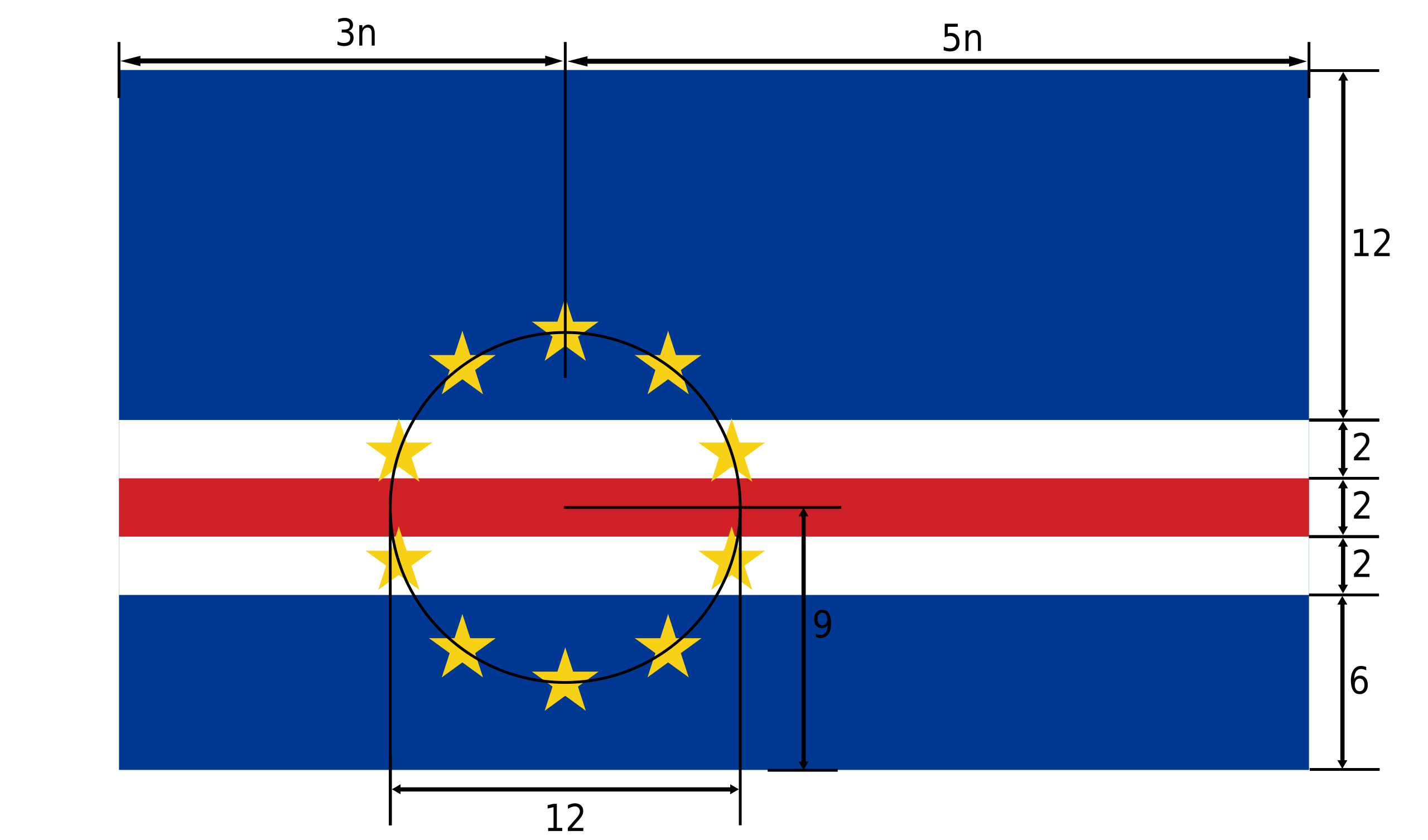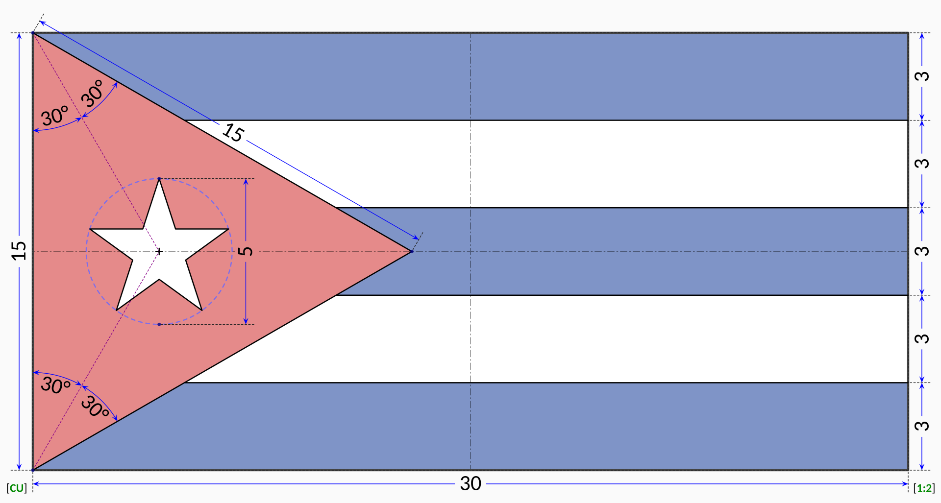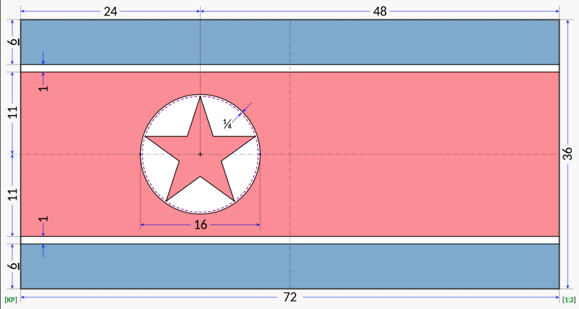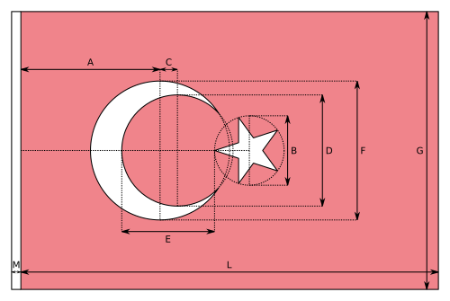 Explicación: Las líneas HI, RS, FE, ED, JG, OQ, JK y UV son imaginarias. De igual manera, los círculos externo e interno del sol y los demás arcos, excepto la luna creciente, son imaginarios. Estos no se muestran en la bandera.