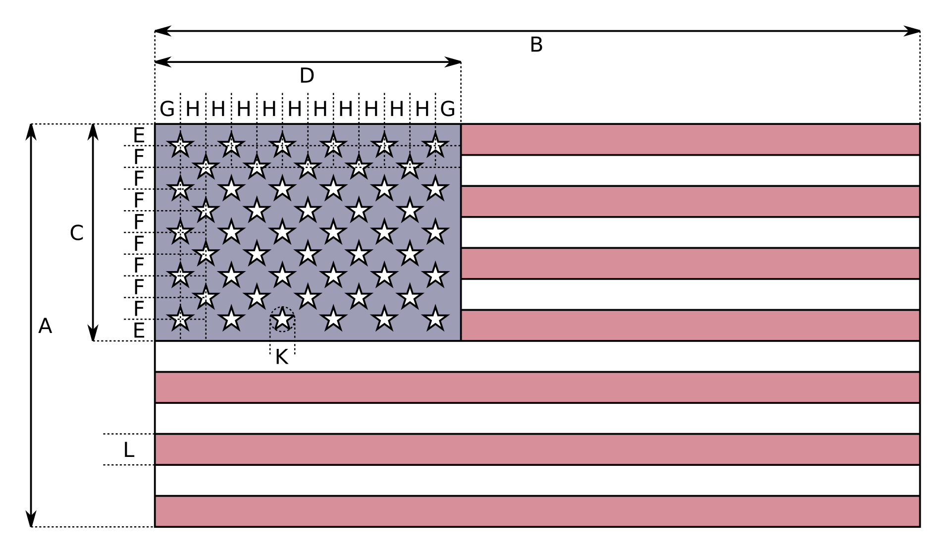 El diseño básico de la bandera actual se especifica en el título 4 del Código de los Estados Unidos, que incluye la adición de nuevas estrellas para representar a nuevos estados. La especificación de la construye se regulan en la orden ejecutiva dictada de 21 de agosto de 1959 dictada por el presidente Dwight. Eisenhower: