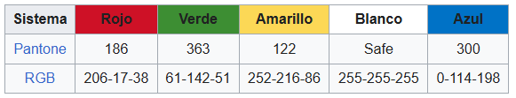 El color rojo, en el sistema RGB es 206, 17, 38 y el verde es 61, 142, 51.